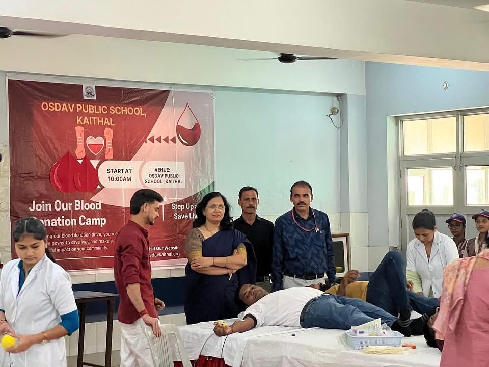 The camp was conducted by the school's National Service Scheme (NSS) unit. The program was inaugurated by the Principal, Mrs. Anju Talwar, who highlighted that a total of 42 units of blood were donated during the camp—a commendable contribution toward social service and human welfare.The entire event was successfully coordinated by the NSS volunteers under the guidance of the Principal. The Red Cross Society, Kaithal, extended special support for this noble cause. The Principal expressed heartfelt gratitude to all the donors and volunteers, stating that "Blood donation is the greatest donation." She emphasized that it not only saves lives but also strengthens the spirit of humanity, service, and compassion in society. She encouraged everyone to continue such acts of service